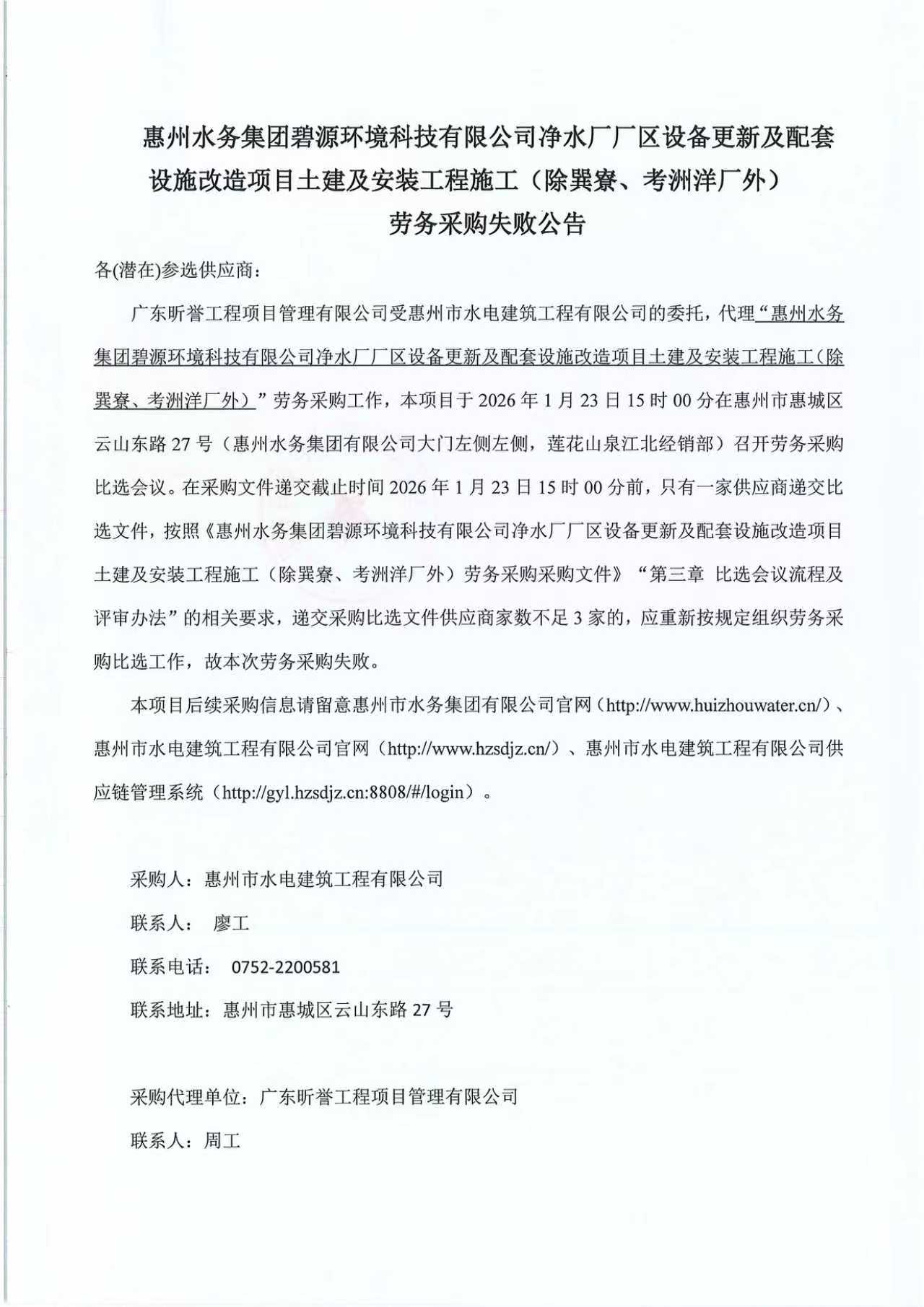惠州水務集團碧源環(huán)境科技有限公司凈水廠廠區(qū)設備更新及配套設施改造項目土建及安裝工程施工(除巽寮、考洲洋廠外)勞務采購失敗公告